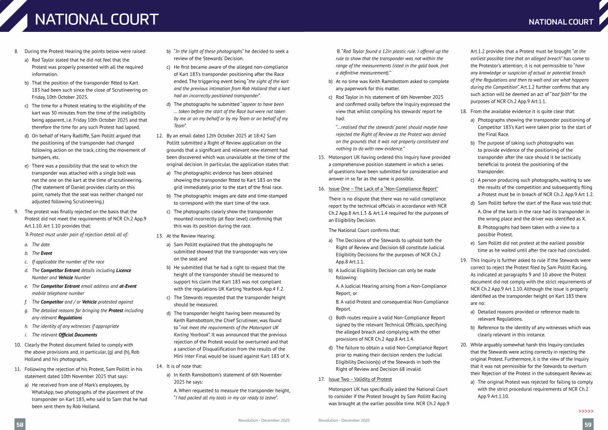 B.“ Rod Taylor found a 12in plastic rule. I offered up the rule to show that the transponder was not within the range of the measurements listed in the gold book.( not a definitive measurement).” b) At no time was Keith Ramsbottom asked to complete any paperwork for this matter. c) Rod Taylor in his statement of 6th November 2025 and confirmed orally before the Inquiry expressed the view that whilst compiling his stewards’ report he had:“… realised that the stewards’ panel should maybe have rejected the Right of Review as the Protest was denied on the grounds that it was not properly constituted and nothing to do with new evidence.”