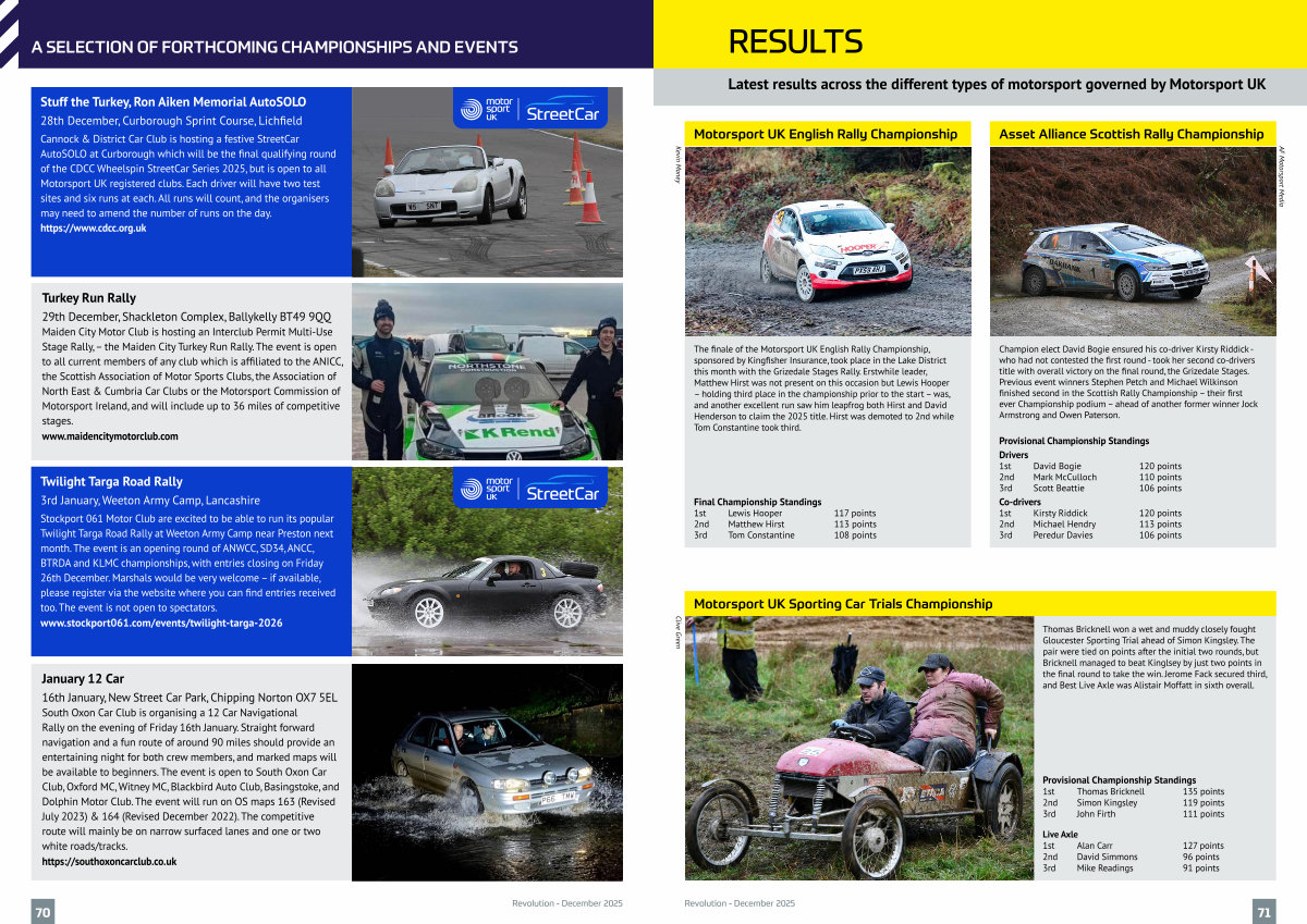The finale of the Motorsport UK English Rally Championship, sponsored by Kingfisher Insurance, took place in the Lake District this month with the Grizedale Stages Rally. Erstwhile leader, Matthew Hirst was not present on this occasion but Lewis Hooper – holding third place in the championship prior to the start – was, and another excellent run saw him leapfrog both Hirst and David Henderson to claim the 2025 title. Hirst was demoted to 2nd while Tom Constantine took third.