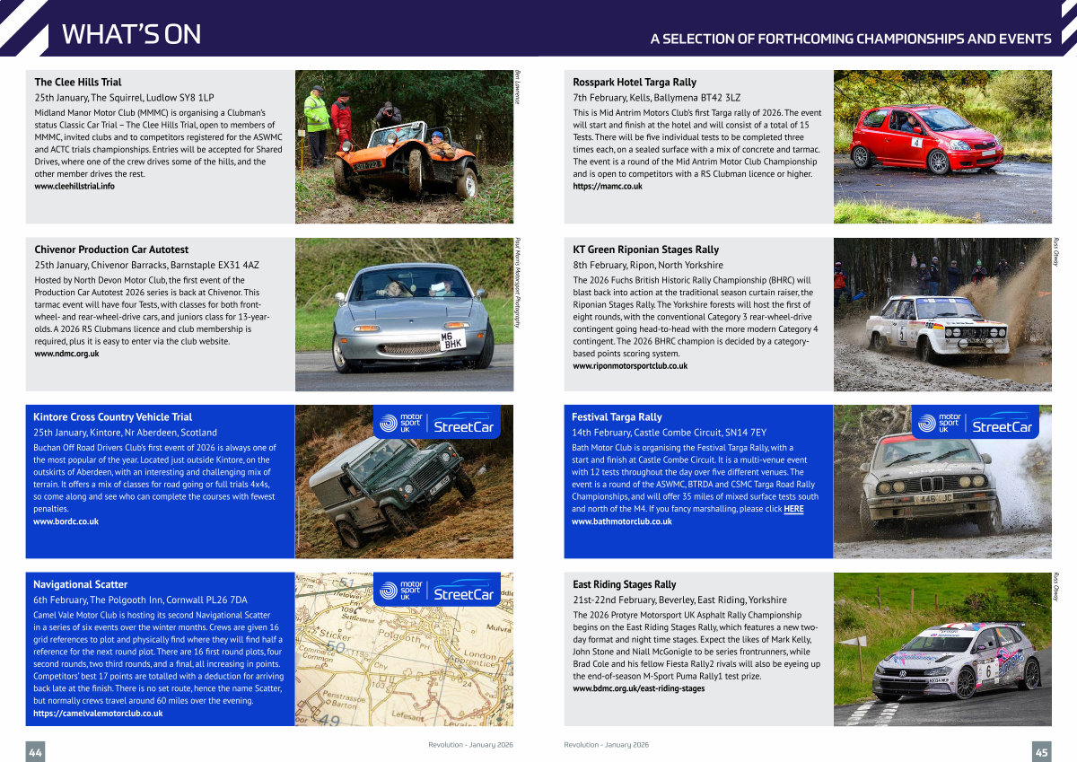 Chivenor Production Car Autotest 25th January, Chivenor Barracks, Barnstaple EX31 4AZ Hosted by North Devon Motor Club, the first event of the Production Car Autotest 2026 series is back at Chivenor. This tarmac event will have four Tests, with classes for both frontwheel- and rear-wheel-drive cars, and juniors class for 13-yearolds. A 2026 RS Clubmans licence and club membership is required, plus it is easy to enter via the club website. www. ndmc. org. uk