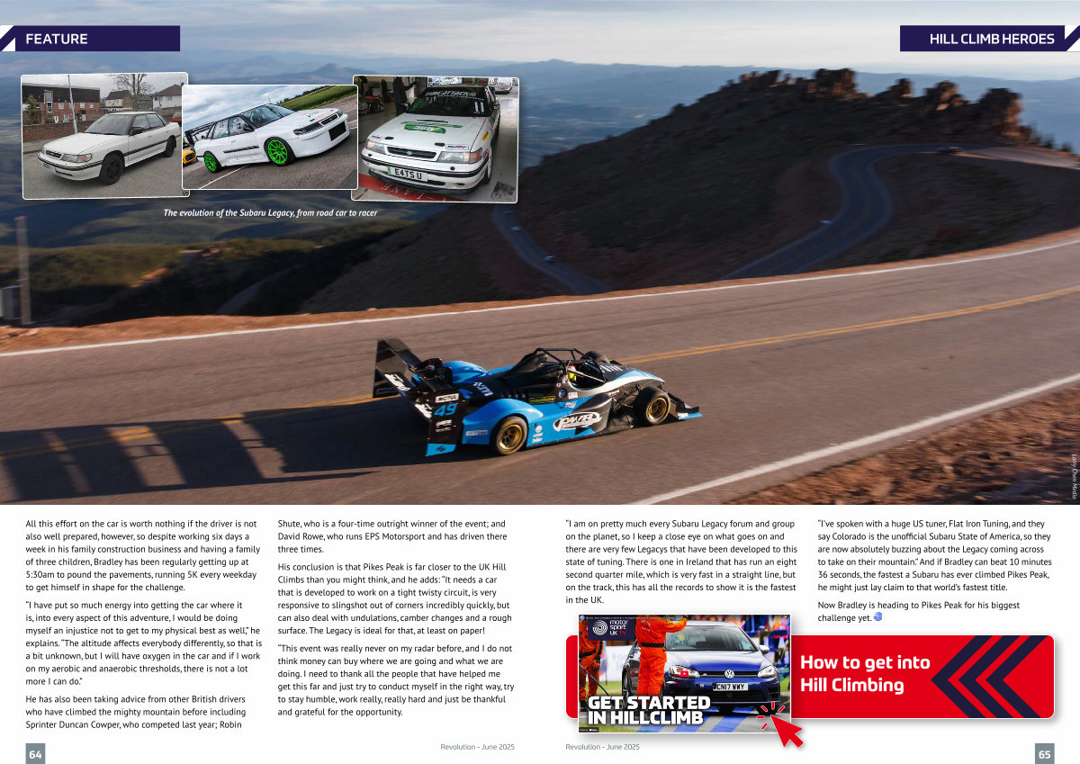 His conclusion is that Pikes Peak is far closer to the UK Hill Climbs than you might think, and he adds:“ It needs a car that is developed to work on a tight twisty circuit, is very responsive to slingshot out of corners incredibly quickly, but can also deal with undulations, camber changes and a rough surface. The Legacy is ideal for that, at least on paper!