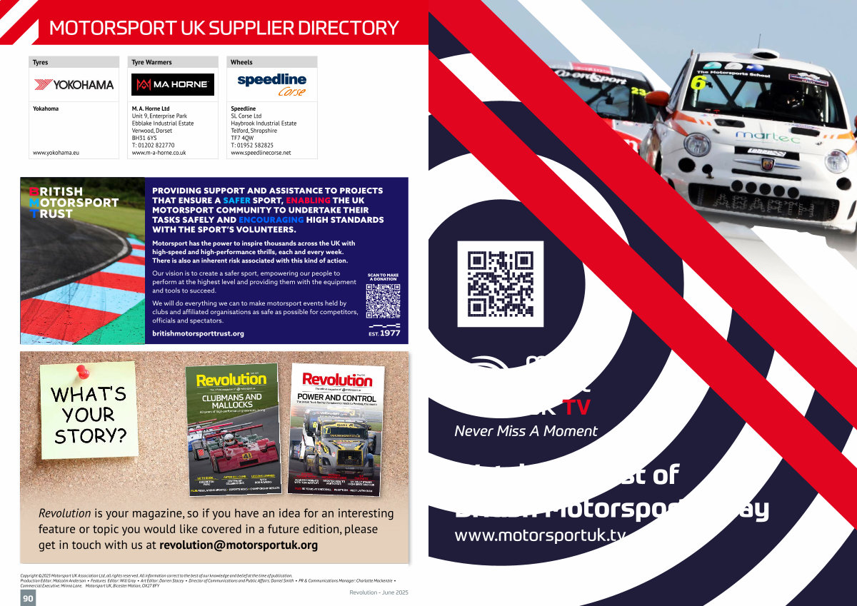 Copyright © 2025 Motorsport UK Association Ltd, all rights reserved. All information correct to the best of our knowledge and belief at the time of publication. Production Editor: Malcolm Anderson • Features Editor: Will Gray • Art Editor: Darren Stacey • Director of Communications and Public Affairs: Daniel Smith • PR & Communications Manager: Charlotte Mackenzie • Commercial Executive: Minna Lane. Motorsport UK, Bicester Motion, OX27 8FY