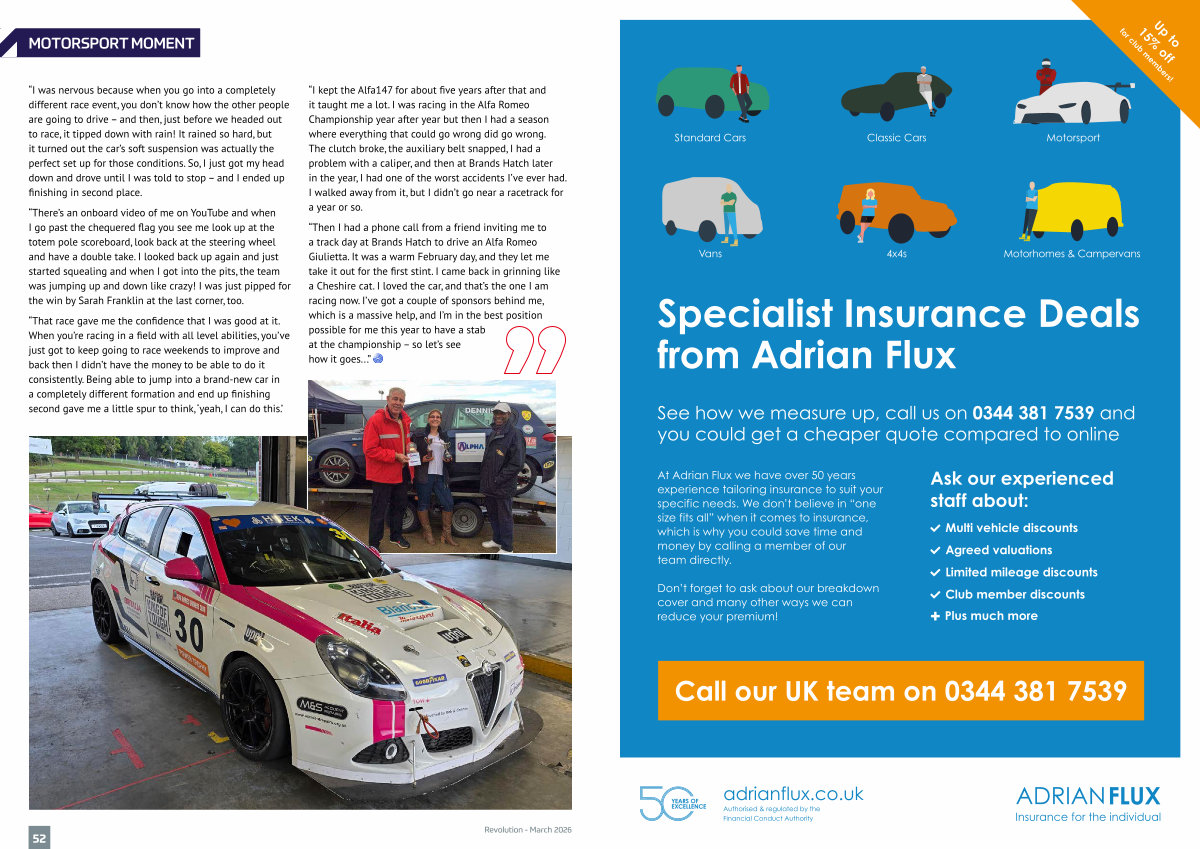 “ Then I had a phone call from a friend inviting me to a track day at Brands Hatch to drive an Alfa Romeo Giulietta. It was a warm February day, and they let me take it out for the first stint. I came back in grinning like a Cheshire cat. I loved the car, and that’ s the one I am racing now. I’ ve got a couple of sponsors behind me, which is a massive help, and I’ m in the best position possible for me this year to have a stab at the championship – so let’ s see how it goes...”