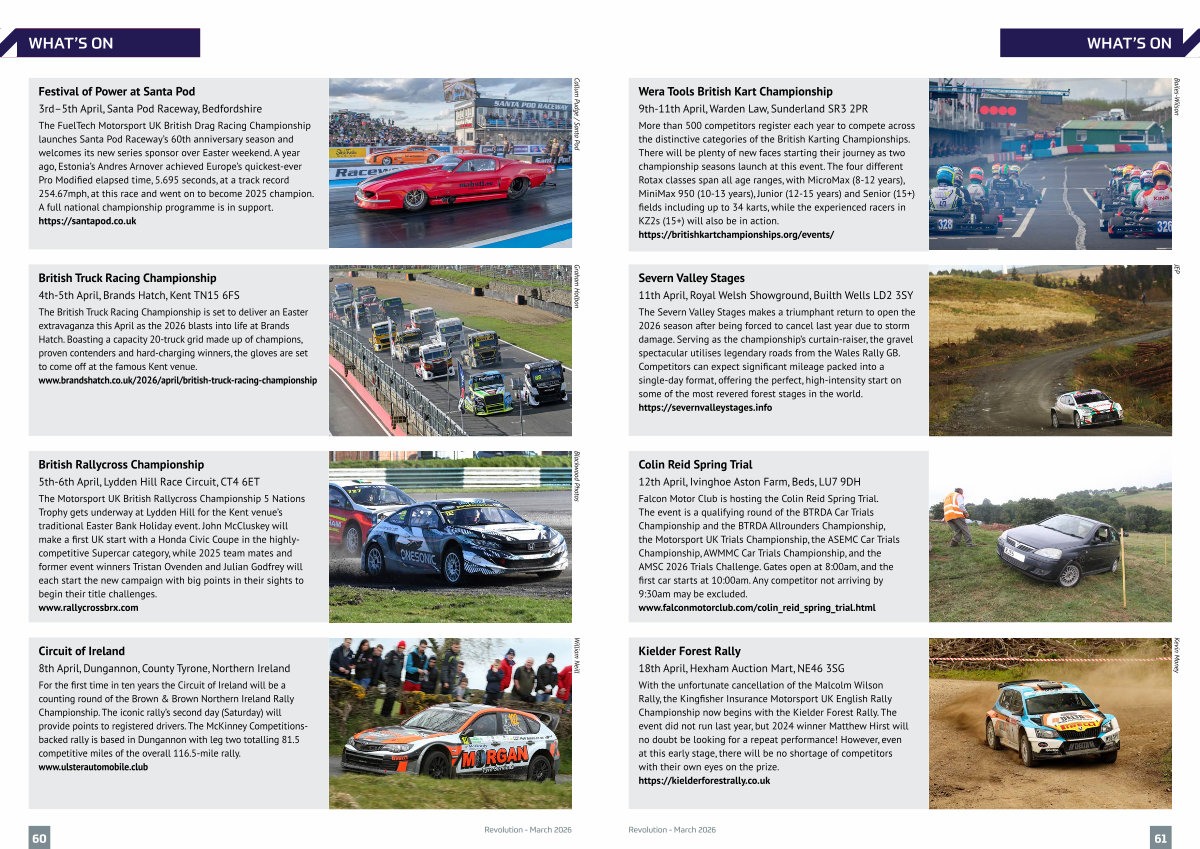 Festival of Power at Santa Pod 3rd – 5th April, Santa Pod Raceway, Bedfordshire The FuelTech Motorsport UK British Drag Racing Championship launches Santa Pod Raceway’ s 60th anniversary season and welcomes its new series sponsor over Easter weekend. A year ago, Estonia’ s Andres Arnover achieved Europe’ s quickest-ever Pro Modified elapsed time, 5.695 seconds, at a track record 254.67mph, at this race and went on to become 2025 champion. A full national championship programme is in support. https:// santapod. co. uk