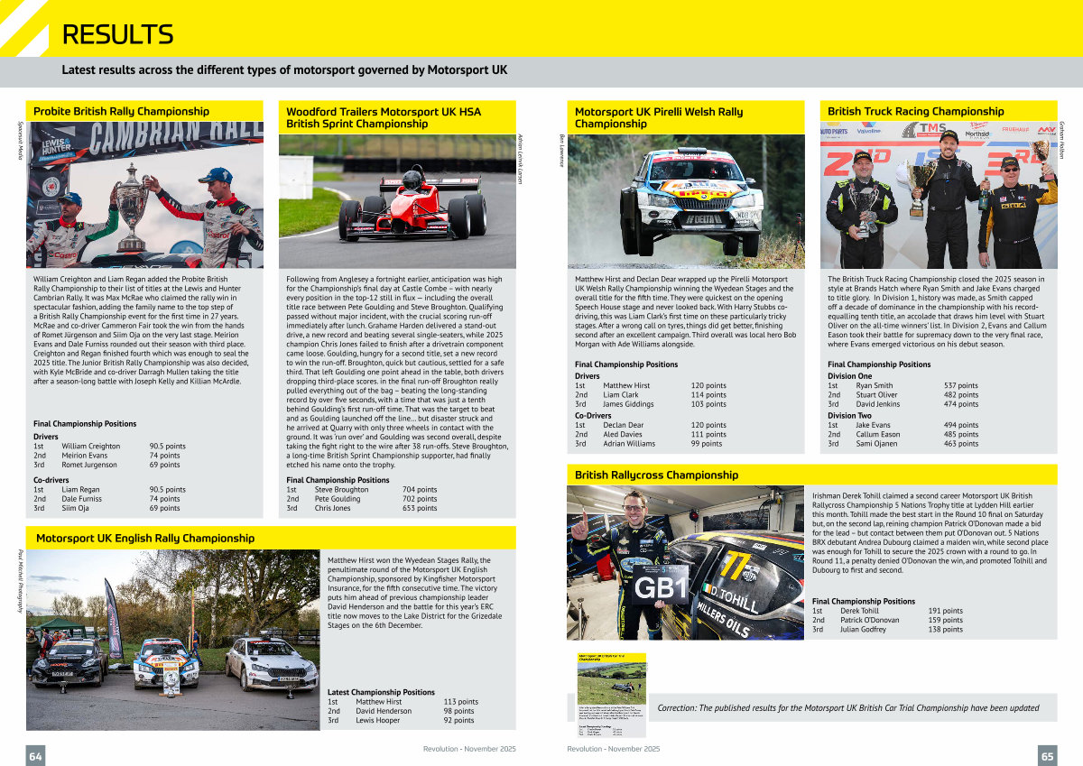 William Creighton and Liam Regan added the Probite British Rally Championship to their list of titles at the Lewis and Hunter Cambrian Rally. It was Max McRae who claimed the rally win in spectacular fashion, adding the family name to the top step of a British Rally Championship event for the first time in 27 years. McRae and co-driver Cammeron Fair took the win from the hands of Romet Jürgenson and Siim Oja on the very last stage. Meirion Evans and Dale Furniss rounded out their season with third place. Creighton and Regan finished fourth which was enough to seal the 2025 title. The Junior British Rally Championship was also decided, with Kyle McBride and co-driver Darragh Mullen taking the title after a season-long battle with Joseph Kelly and Killian McArdle. |