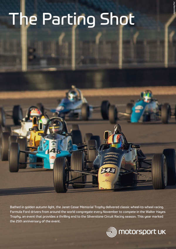 Bathed in golden autumn light, the Janet Cesar Memorial Trophy delivered classic wheel-to-wheel racing. Formula Ford drivers from around the world congregate every November to compete in the Walter Hayes Trophy, an event that provides a thrilling end to the Silverstone Circuit Racing season. This year marked the 25th anniversary of the event.