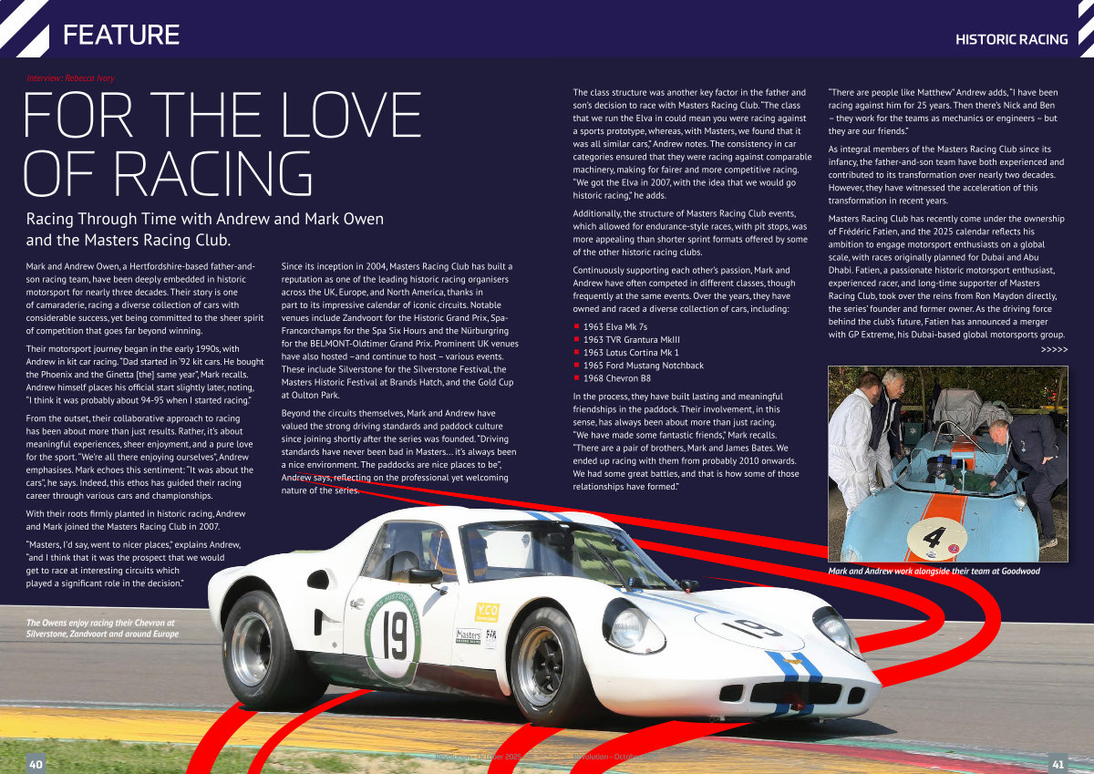 The class structure was another key factor in the father and son’ s decision to race with Masters Racing Club.“ The class that we run the Elva in could mean you were racing against a sports prototype, whereas, with Masters, we found that it was all similar cars,” Andrew notes. The consistency in car categories ensured that they were racing against comparable machinery, making for fairer and more competitive racing.“ We got the Elva in 2007, with the idea that we would go historic racing,” he adds.