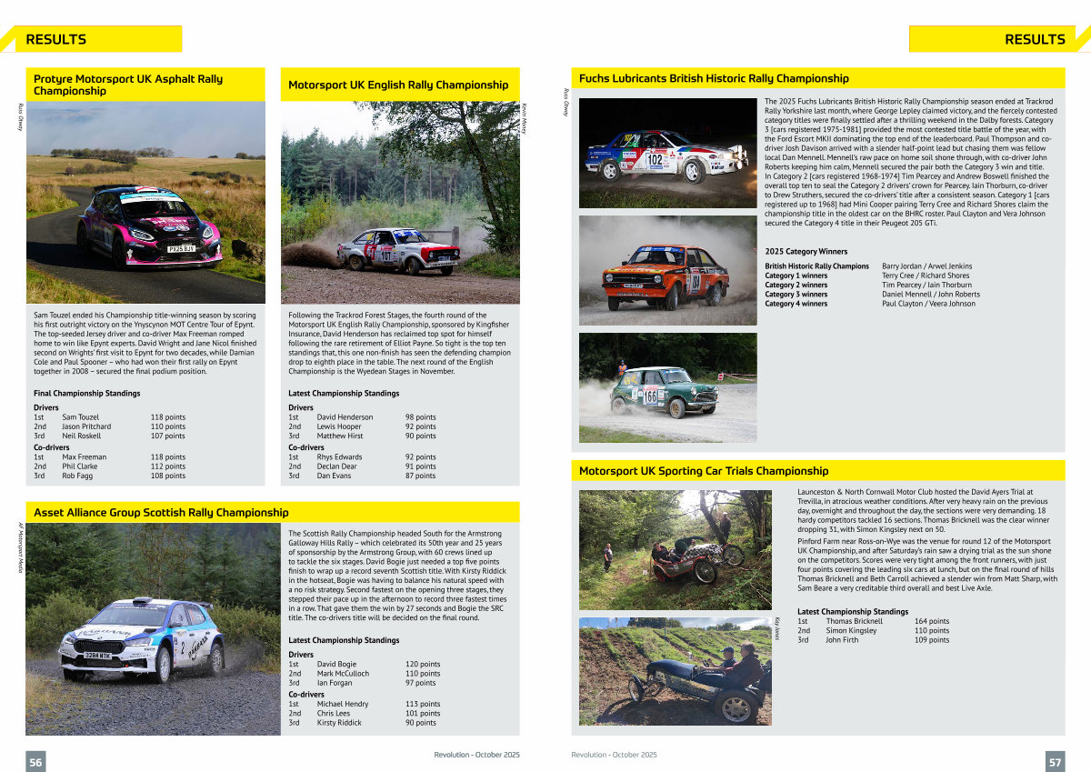 The 2025 Fuchs Lubricants British Historic Rally Championship season ended at Trackrod Rally Yorkshire last month, where George Lepley claimed victory, and the fiercely contested category titles were finally settled after a thrilling weekend in the Dalby forests. Category 3 [ cars registered 1975-1981 ] provided the most contested title battle of the year, with the Ford Escort MKII dominating the top end of the leaderboard. Paul Thompson and codriver Josh Davison arrived with a slender half-point lead but chasing them was fellow local Dan Mennell. Mennell’ s raw pace on home soil shone through, with co-driver John Roberts keeping him calm, Mennell secured the pair both the Category 3 win and title. In Category 2 [ cars registered 1968-1974 ] Tim Pearcey and Andrew Boswell finished the overall top ten to seal the Category 2 drivers’ crown for Pearcey. Iain Thorburn, co-driver to Drew Struthers, secured the co-drivers’ title after a consistent season. Category 1 [ cars registered up to 1968 ] had Mini Cooper pairing Terry Cree and Richard Shores claim the championship title in the oldest car on the BHRC roster. Paul Clayton and Vera Johnson secured the Category 4 title in their Peugeot 205 GTi.