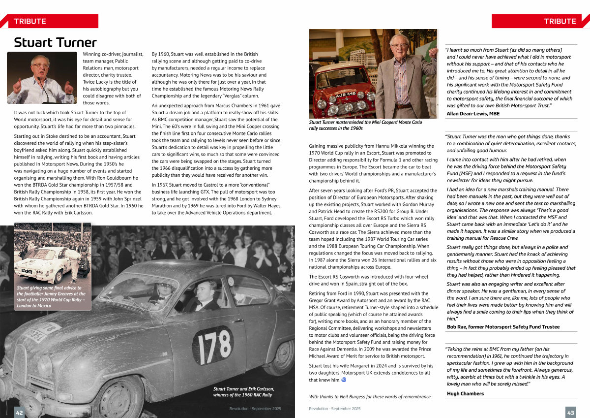Retiring from Ford in 1990, Stuart was presented with the Gregor Grant Award by Autosport and an award by the RAC MSA. Of course, retirement Turner-style shaped into a schedule of public speaking( which of course he attained awards for), writing more books, and as an honorary member of the Regional Committee, delivering workshops and newsletters to motor clubs and volunteer officials, being the driving force behind the Motorsport Safety Fund and raising money for Race Against Dementia. In 2009 he was awarded the Prince Michael Award of Merit for service to British motorsport.