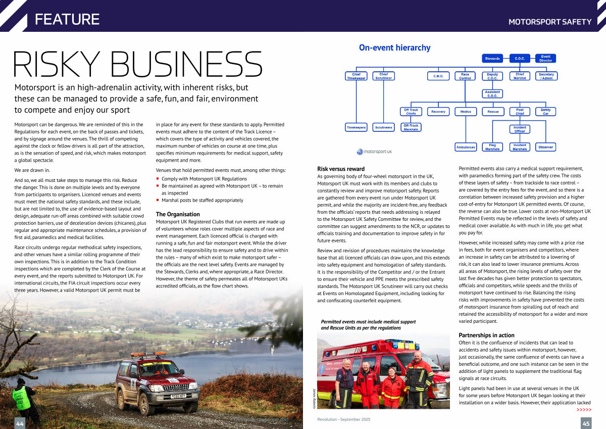 As governing body of four-wheel motorsport in the UK, Motorsport UK must work with its members and clubs to constantly review and improve motorsport safety. Reports are gathered from every event run under Motorsport UK permit, and while the majority are incident-free, any feedback from the officials’ reports that needs addressing is relayed to the Motorsport UK Safety Committee for review, and the committee can suggest amendments to the NCR, or updates to officials training and documentation to improve safety in for future events.