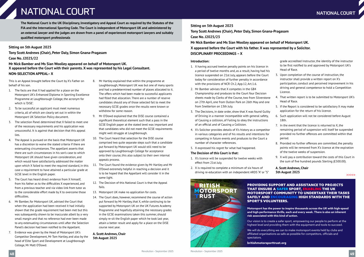 The National Court is the UK Disciplinary, Investigatory and Appeal Court as required by the Statutes of the FIA and the International Sporting Code. The Court is independent of Motorsport UK and administered by an external lawyer and the judges are drawn from a panel of experienced motorsport lawyers and suitably qualified motorsport professionals