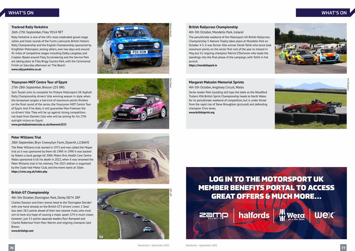 Trackrod Rally Yorkshire 26th-27th September, Filey YO14 9ET Rally Yorkshire is one of the UK’ s most celebrated gravel stage rallies and hosts rounds of the Fuchs Lubricants British Historic Rally Championship and the English Championship sponsored by Kingfisher Motorsport, among others, over two days and around 45 miles of competitive stages including Dalby, Langdale, and Cropton. Based around Filey, Scrutineering and the Service Park are taking place at Filey Brigg Country Park, with the Ceremonial Finish on Saturday afternoon on‘ The Beach’. www. rallyyorkshire. co. uk
